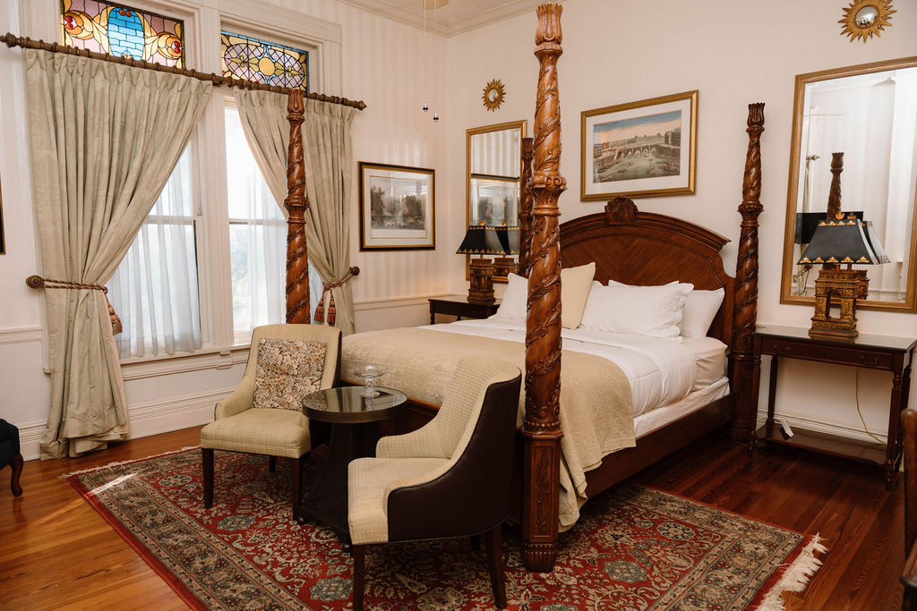 Nestled in a sunny corner on the east side of the second floor, the T.C. Burke Suite offers timeless elegance and restful comfort. This spacious retreat features a stately California king four-poster bed, original stained glass, and large windows that fill the room with natural light and offer views of the historic homes along Georgia Avenue.